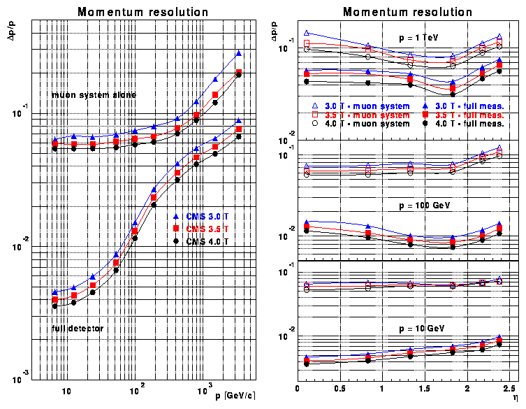 momentum resolution - 3.0, 3.5 and 4.0 Tesla